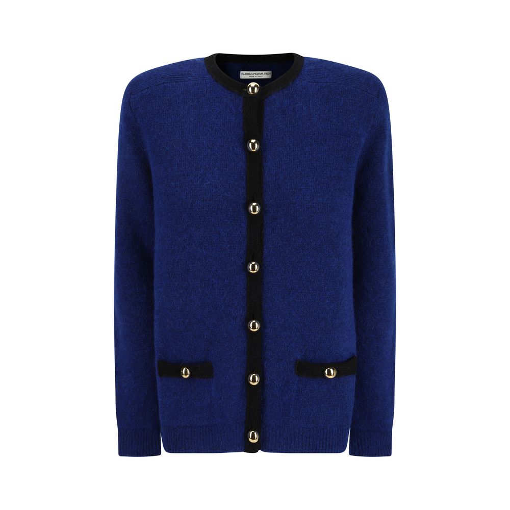 Alpaca Cardigan by Alessandra Rich, front button closure, ribbed cuffs, contrasting crew neck, ribbed hem, two side pockets, structured shoulders, oversize fit.