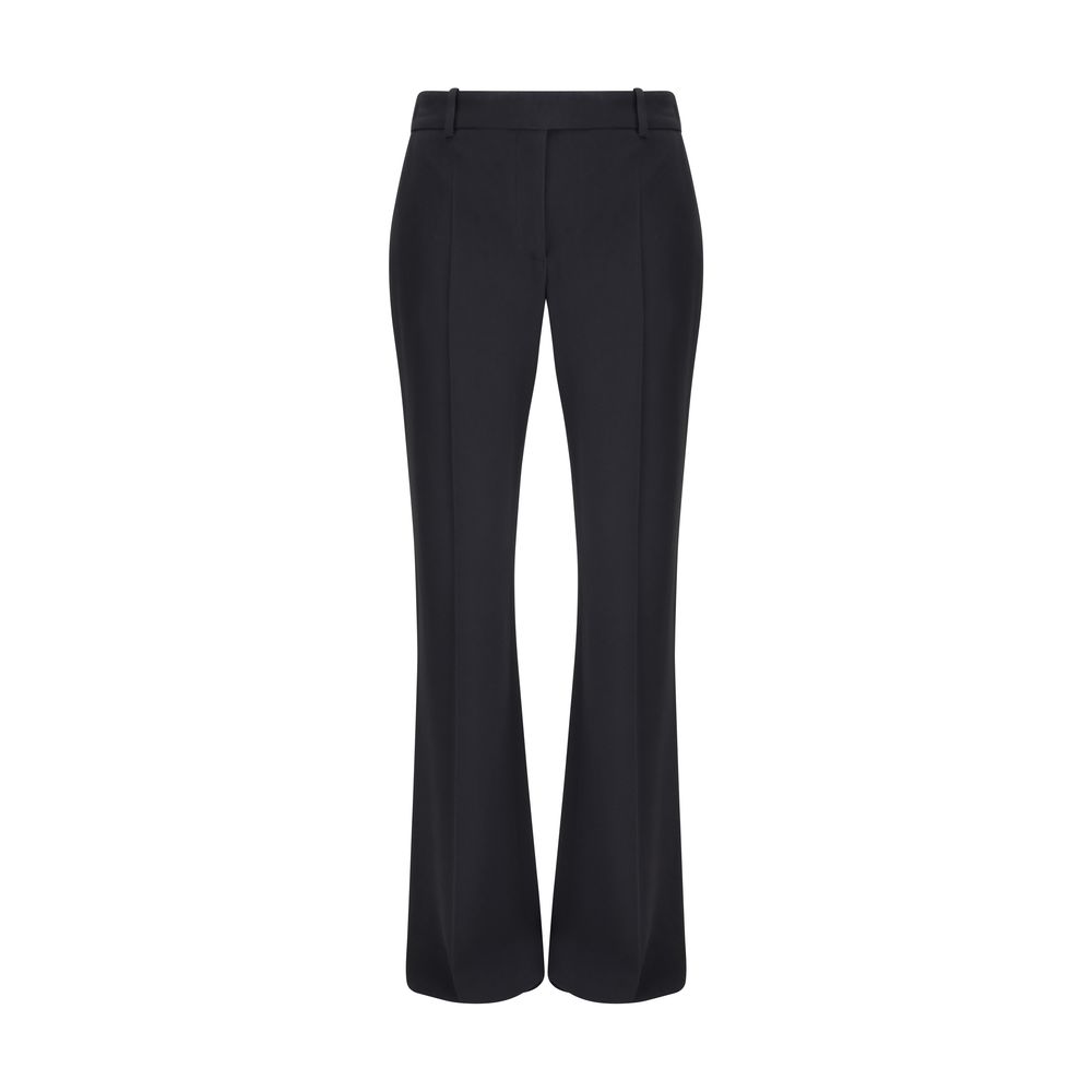 Black Pants by Alexander McQueen, zip closure with hook, two slant pockets on front, flared bottom, welt back pocket.
