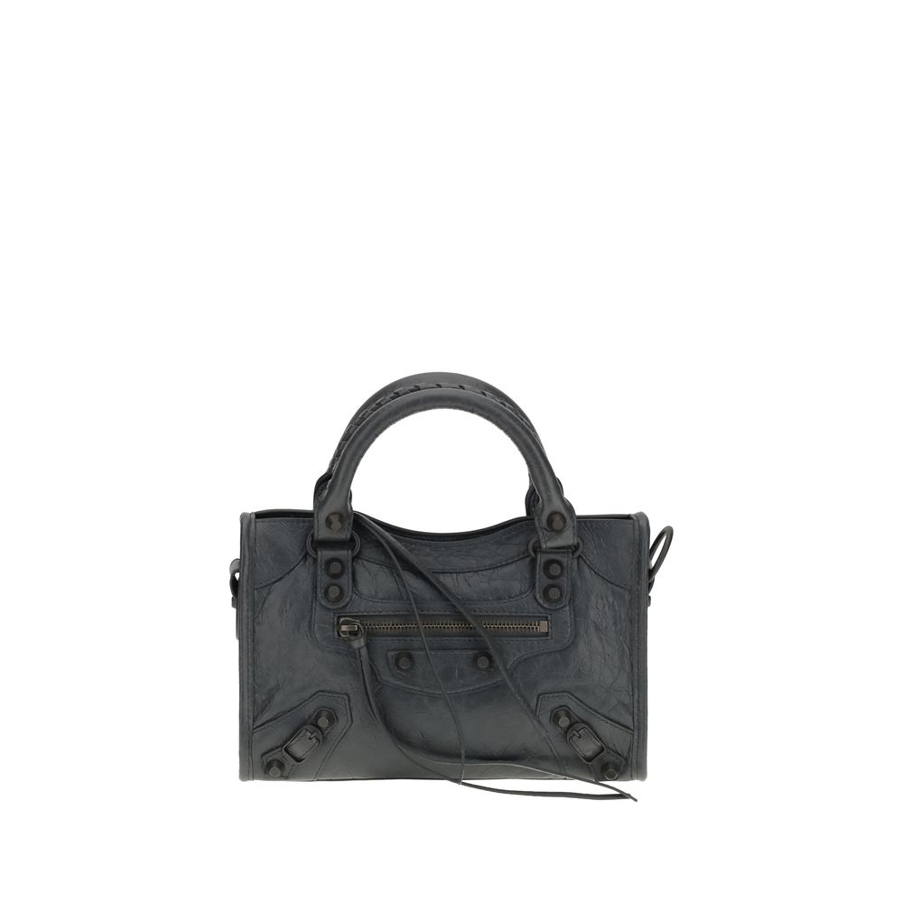 Lambskin Le City mini Handbag by Balenciaga, made of wrinkled-effect Arena Leather, adjustable and removable shoulder strap, two hand-woven leather handles, brass hardware, knotted leather zipper and zipper puller closure, knotted leather front zipper pocket and zipper puller, interior zippered pocket, cotton canvas lining.