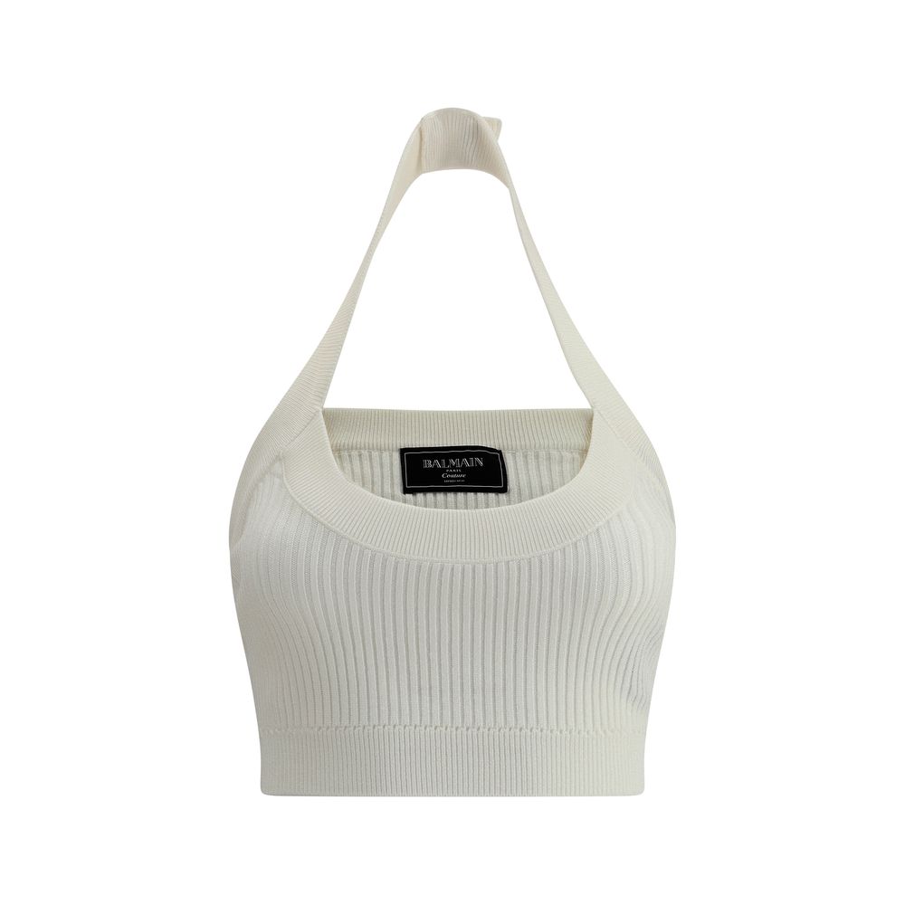Balmain’s Top is a sleek and modern piece with a cropped pattern that enhances the figure. It features an American neckline and an embossed button closure, adding a touch of sophistication. The brand’s iconic monogram patch applied to the front highlights its authenticity and prestige. The ribbed design lends texture and structure, while the fitted fit emphasizes the silhouette in an elegant and sophisticated way.