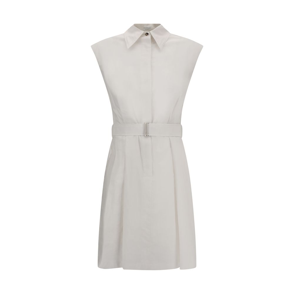 Brunello Cucinelli’s short chemisier Dress is an elegant and versatile garment, characterized by its sleeveless design and pointed collar that enhances its structure. The front closure with hidden buttons gives a clean and sophisticated look, while the matching belt, adjustable with a buckle and removable, allows you to customize the fit, giving a defined and feminine silhouette.