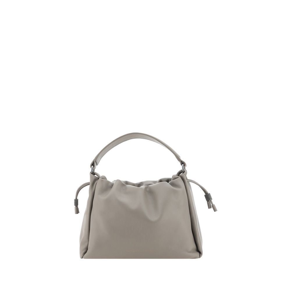 Leather Shoulder Bag by Brunello Cucinelli, one flat top handle, drawstring closure, adjustable and removable shoulder strap, single compartment, iconic brand monogram press-stamped on front, monochrome pattern.