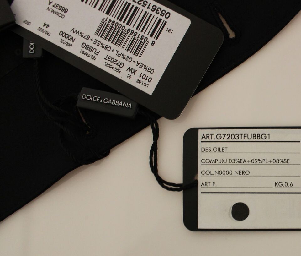 Indulge in the epitome of sophistication with this stunning black dress vest from the MainLine collection of Dolce & Gabbana. Perfectly tailored for the modern gentleman, this vest blends luxury and comfort, crafted of a superior silk-wool blend. With its sleek single-breasted design, adjustable waist strap for the perfect fit, and distinguished logo details, it’s an impeccable choice for special events or significant business meetings. Assembled with meticulous care in Italy, it’s more than just a vest; it’s a statement of style.