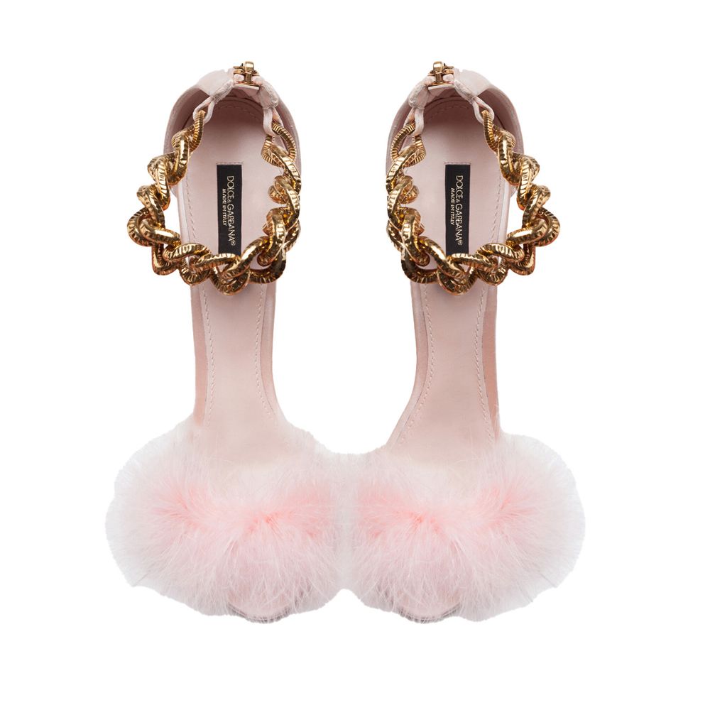 Dolce & Gabbana, Pink Décolleté 100% leather, made in italy,with satin upper, lined with marabou feathers, and embellished with antiqued gold wrapping the ankle.