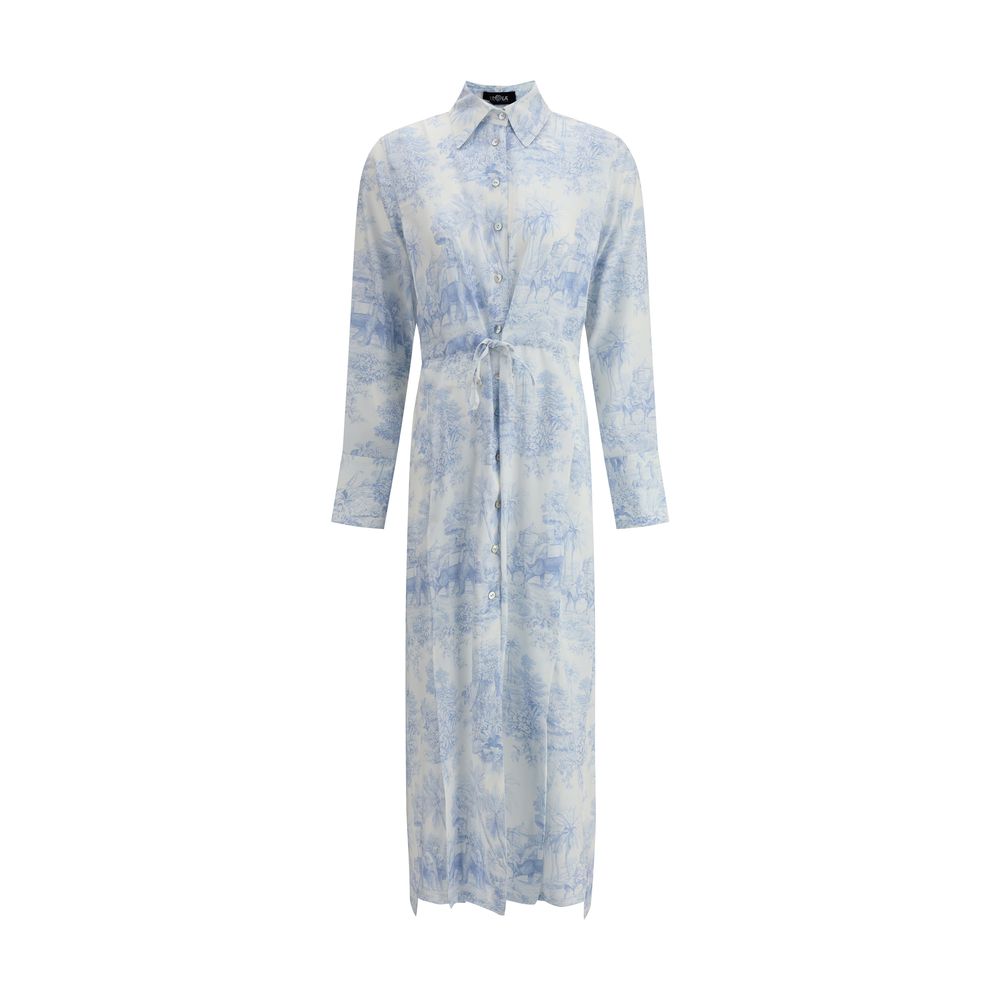 Ella’s coulisse Chemisier Dress is an elegant and sophisticated piece with a classic collar and front button closure that emphasize its refined design. The adjustable drawstring waist allows it to fit the figure perfectly, while the two side welt pockets offer practicality. The built-in V-neck slip adds a feminine touch. The Toile de jouy-style pattern, with its delicate and sophisticated pattern, lends an added accent of elegance. A perfect dress for those seeking a chic and original look.