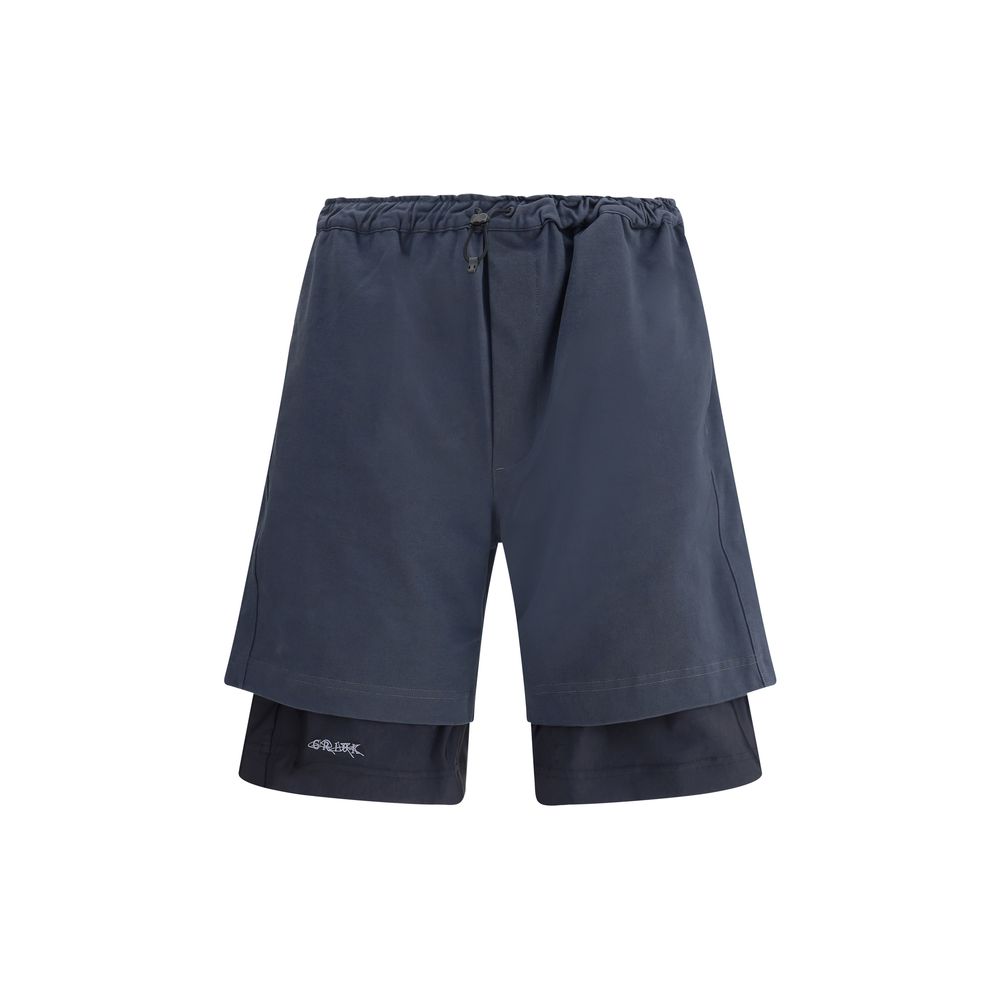 Double-layer shorts by GR10K with an elasticized waistband and adjustable drawstring. Features two side welt pockets and a back patch pocket. Contrasting embroidered GR10K monogram on the front adds a distinctive touch to the essential and functional design.