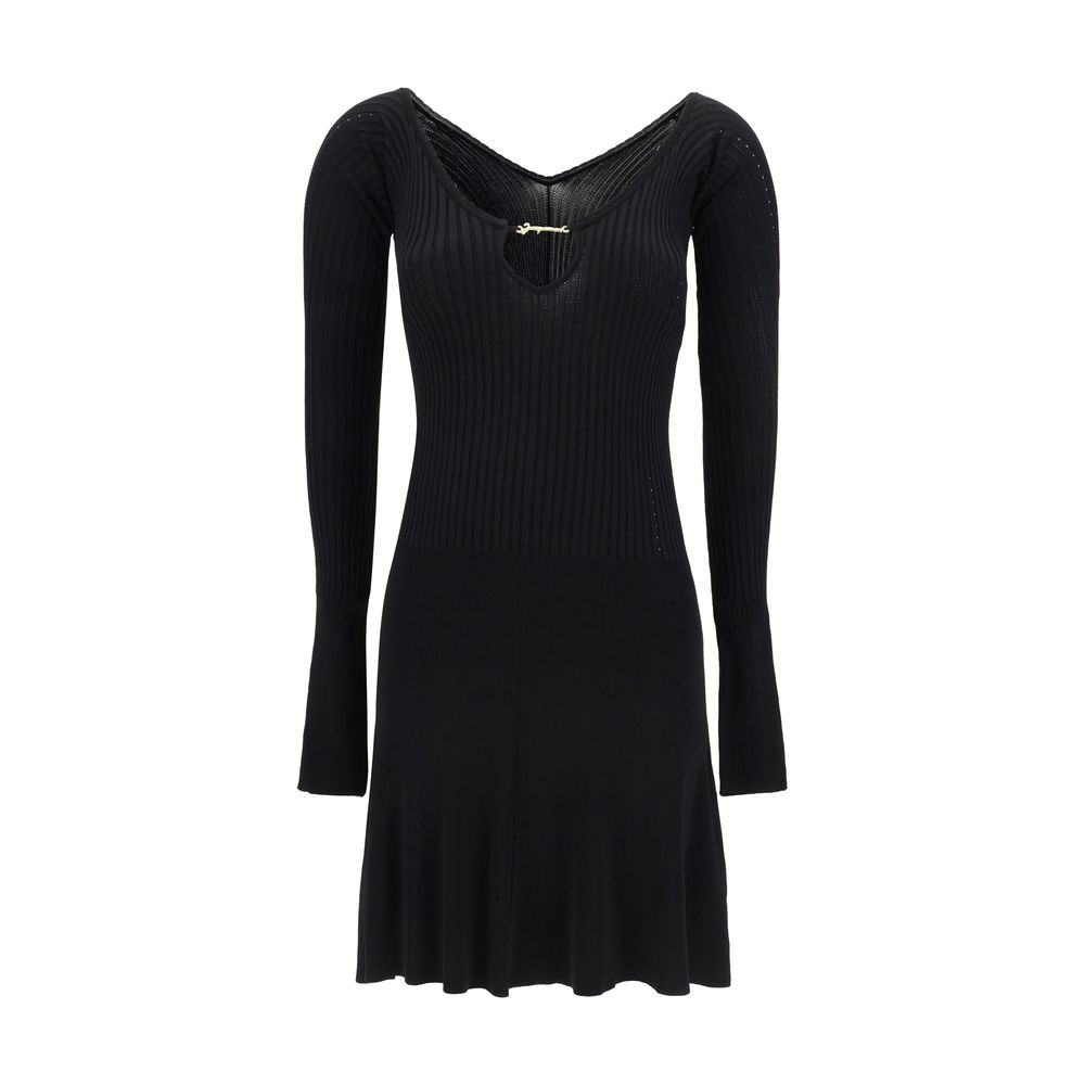 The La Mini Robe Pralu Dress by Jacquemus features a wide V-neck at the front, enhanced by an appliquéd three-dimensional plaque detail that adds a touch of originality and sophistication. Long sleeves complete the design, while the flared skirt lends elegant movement. The fitted fit enhances the silhouette, making this dress ideal for a sophisticated and modern look.