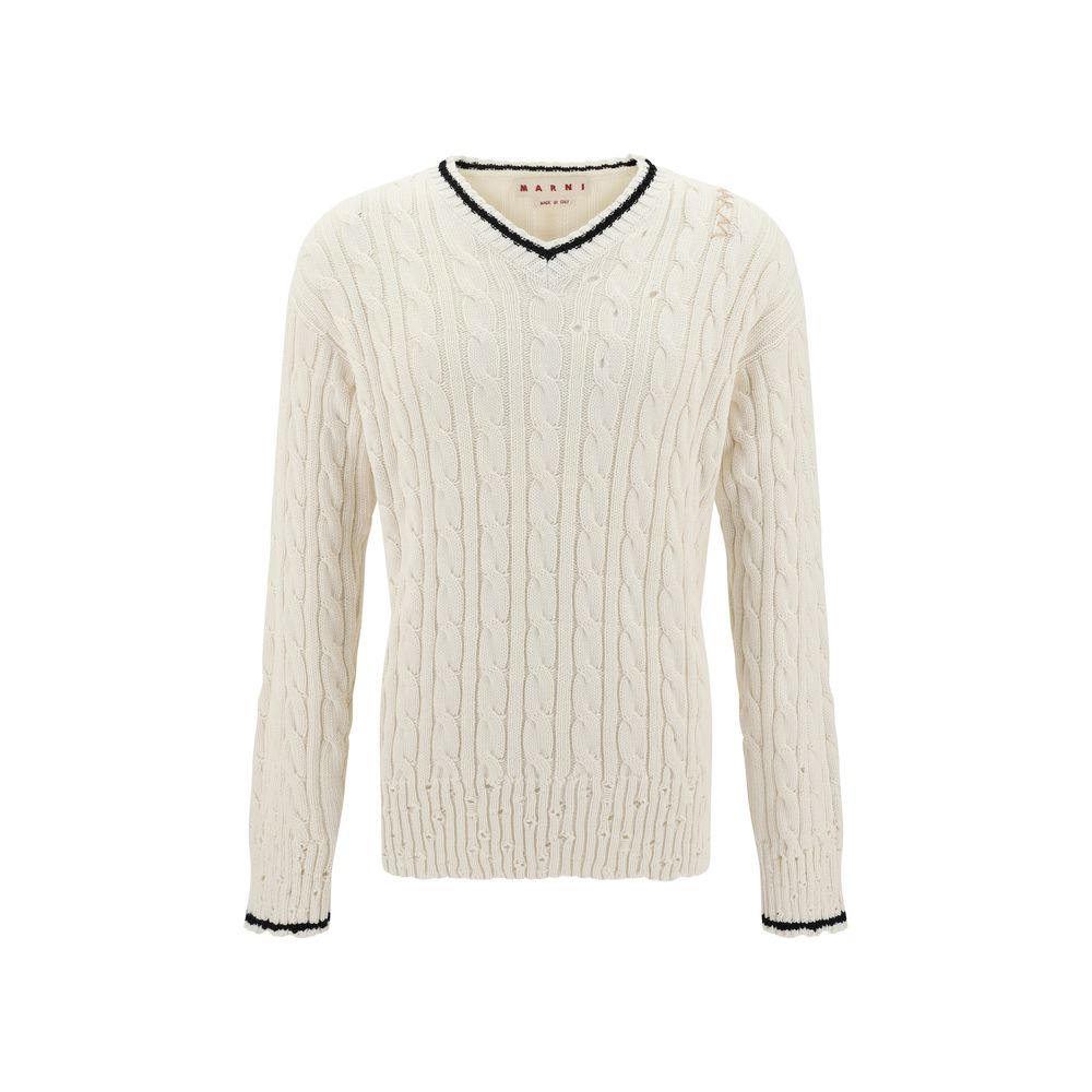 Marni’s cotton Sweater is a stylish and versatile piece perfect for those seeking a refined yet casual look. Featuring a V-shaped front drape, which adds a touch of originality, the sweater has ribbed cuffs and a high ribbed hem, which help define a clean, modern silhouette. The cable-knit weave gives the garment an interesting texture, adding depth and sophisticated visual detail.