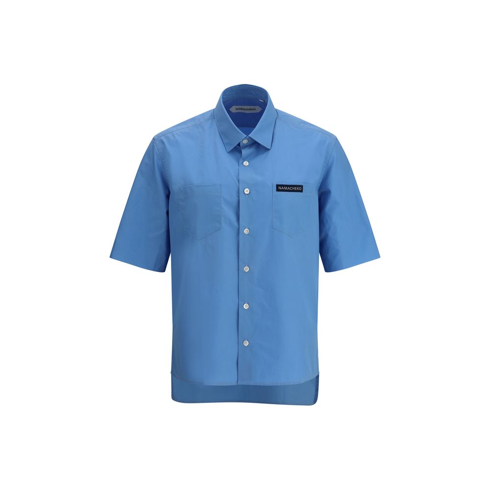 Namacheko’s cotton Guard Shirt offers a modern and functional design. The short-sleeved design features a classic collar and a front button closure. Two welt patch pockets on the front and a patch with the brand’s iconic monogram on one pocket add a distinctive touch. Side slits and an asymmetric hem complete the garment, giving it a unique and contemporary silhouette.