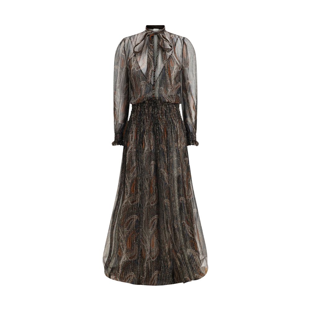 The Saint Laurent Long Lavallière Dress is a masterpiece of elegance and sophistication, designed for those who love a sophisticated and timeless style. Made of sheer silk chiffon with a delicate Paisley pattern, the dress is distinguished by the Lavallière tie that adorns the collar, giving it a vintage and romantic touch of class. The button closure adds a refined detail, while the long puff sleeves and ruffle cuffs lend a touch of theatricality and femininity. The elasticated waistband gently emphasizes the figure, creating a harmonious silhouette, while the gathered skirt lends movement and fluidity to the garment.