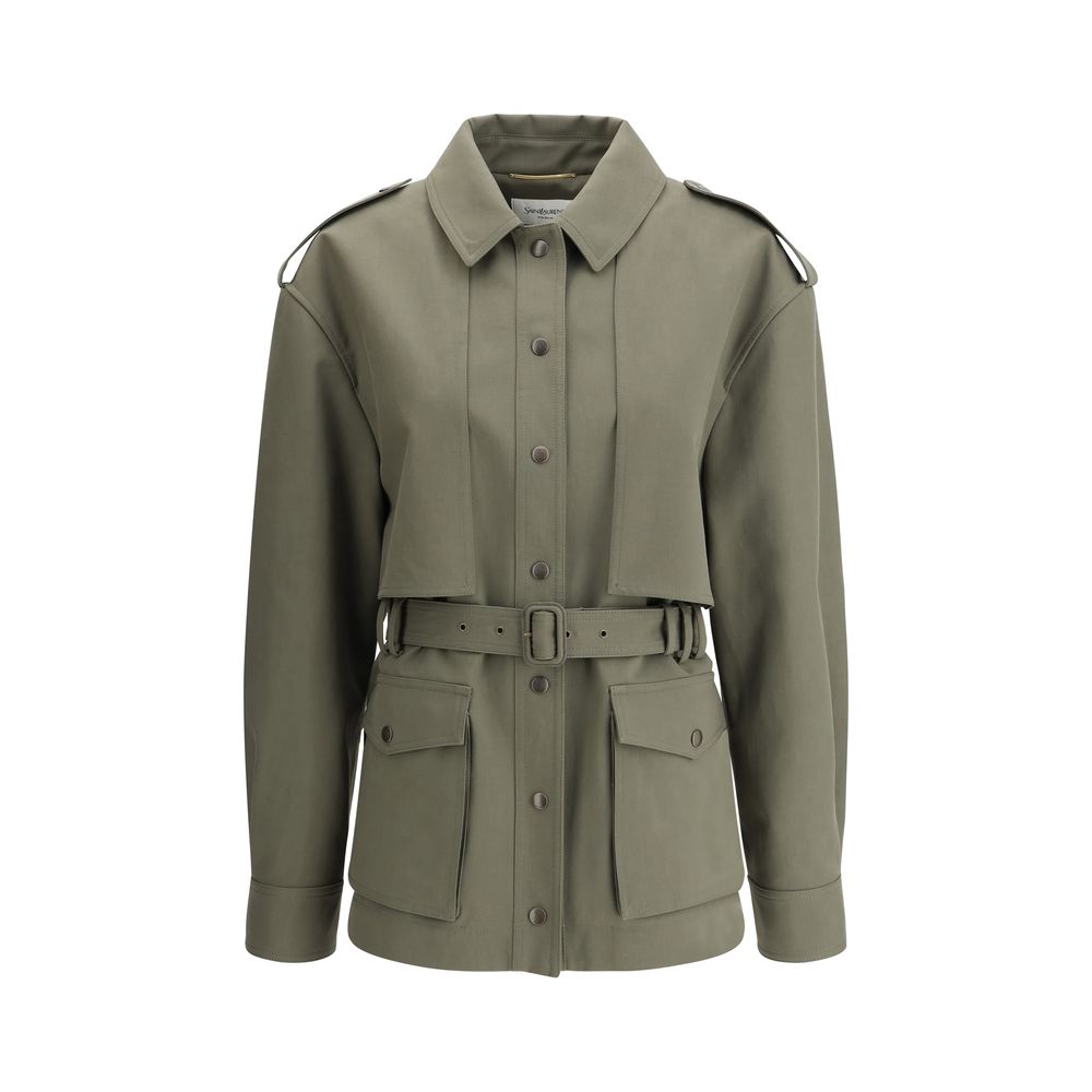 The Saharienne Jacket by Saint Laurent is a versatile and sophisticated piece, perfect for an elegant and practical look. The classic collar and the front closure with snap buttons offer a clean and structured design, while the two patch pockets on the front with flap and buttons add a functional and stylish touch. The belt loops on the waist, together with the adjustable and removable matching belt, allow you to customize the fit, emphasizing the silhouette. An iconic and timeless piece, which combines comfort and class in a perfect way.