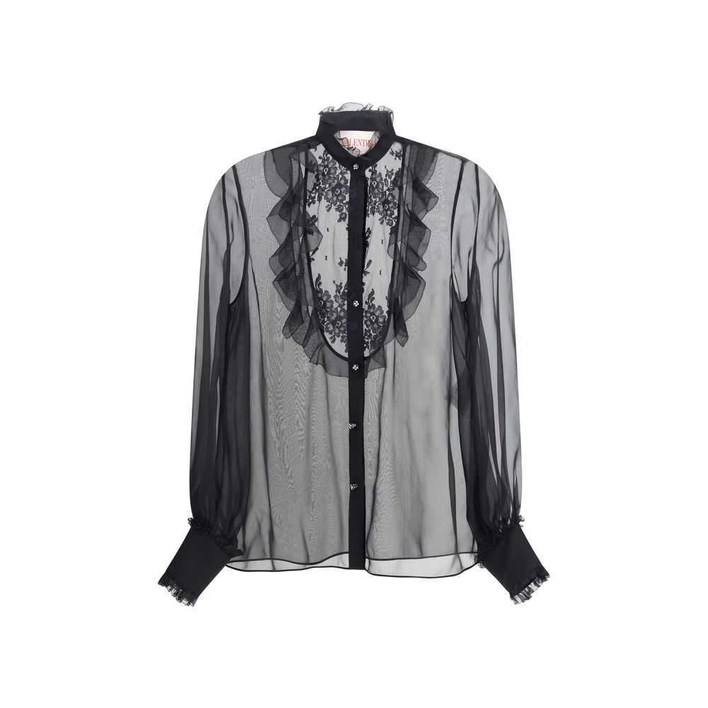 Valentino’s chiffon Shirt is a masterpiece of elegance and femininity. Featuring a front button closure and a high collar, it has delicate ruffle details on the collar and front, adding a romantic touch. The lace, the protagonist of the design, enriches the garment with a refined texture, making it perfect for special occasions or a sophisticated everyday look.