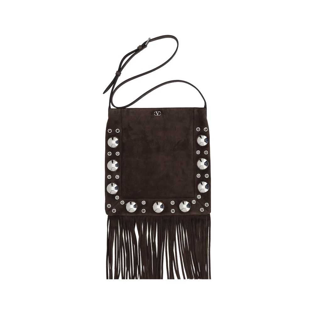 Valentino Garavani’s suede leather Shoulder Bag combines elegance and character. The adjustable shoulder strap ensures comfort, while the zippered closure protects the items inside. The iconic logo patch applied to the front adds a recognizable touch. Circular mirror details on the front and back. Fringing on the bottom gives movement, making this bag perfect for a contemporary and refined look suitable for any occasion. A mix of sophistication and bold style.