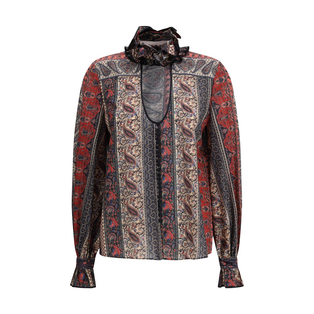 Valentino’s Paisley Print Shirt is an elegant garment with a boho-chic flair, perfect for enriching your wardrobe with a refined and original touch. Featuring a high mandarin collar framed by delicate ruffles, it has a V-neckline that adds femininity and lightness to the silhouette. Long sleeves and a front button closure complete the design, while the vibrant paisley print expresses all the decorative and iconic appeal of the house.