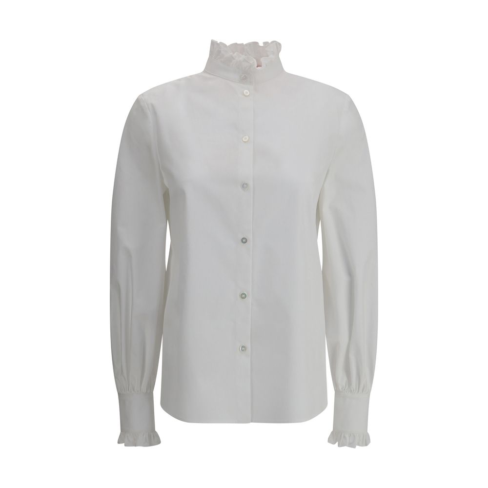 The Valentino Shirt is a sophisticated and feminine piece, characterized by elegant and delicate details. The front closure with mother-of-pearl buttons adds a touch of discreet luxury, while the cuffs and crew neck with ruffles give a romantic and refined dimension. These details embellish the shirt, making it ideal for those seeking an elegant style but with a touch of originality. Perfect for pairing with both formal looks and more casual combinations, this shirt is a true must-have for those who love the timeless charm of Valentino.